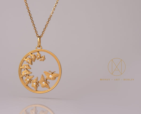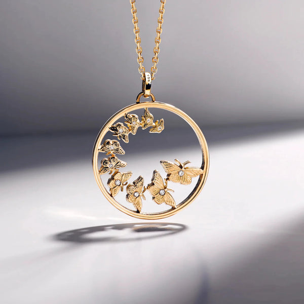 Die zehn Monarchfalter im Kettenanhänger sind nur noch durch winzige Verbindungsstellen mit dem Rahmen verbunden. So wirkt es, als schwebten die Schmetterlinge schwerelos in ihrem Rahmen. In jeden einzelnen Falter sind edelste Diamanten im Brilliantschliff eingelassen. Die schlichte Eleganz des Anhängers wird so durch luxuriöse Akzente veredelt.