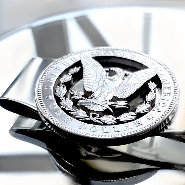 Das Besondere an dieser Geldklammer ist, dass es sich hierbei nicht um Replikas der Münzen, sondern um echte amerikanische Silberdollars handelt. Erkennbar an der eingeprägten Jahreszahl, sind einige dieser Münzen bereits rund 100 Jahre. Die Münze hat bereits einen recht hohen Eigenwert, welcher durch die Bearbeitung noch erhöht wird.